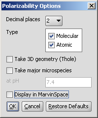 The electric field generated by partial charges of a molecule spread through intermolecular cavities and the solvent. The induced partial charge (induced dipole) has a tendency to diminish the external electric field. This phenomenon is called polarizability. The more stable the ionized site is the more its vicinity is polarizable. This is why atomic polarizability is an important factor in the determination of pKa and why it is considered in our pKa calculation plugin. Atomic polarizability is altered by partial charges of atoms. We use two methods to calculate polarizability: one of the calculations is based on Miller's and Savchik's atomic parameters, while the other method is based on Thole's parameters.
