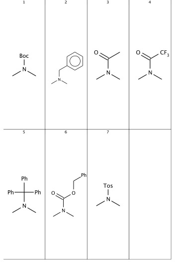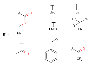 Currently the system can't handle protecting groups having more than one attachment point, or groups where the heavy atoms of the functional group should be changed by the substitution. The readily available definitions contain amine, carboxyl and hydroxyl protecting groups.