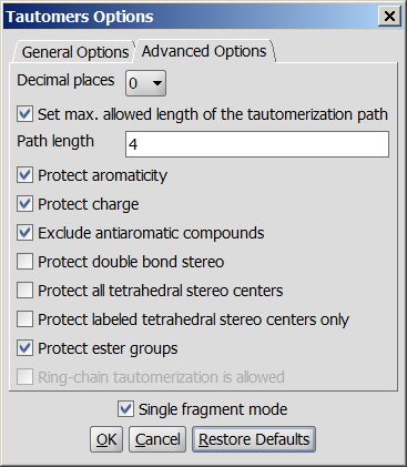 Following options can be adjusted in the Tools > Isomers > Tautomers,