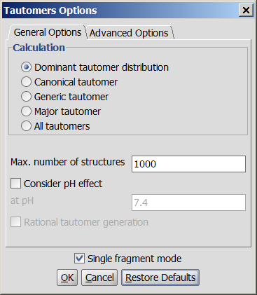 - Canonical tautomer: calculates only the canonical tautomer of the structure. Rational tautomer generation mode can be activated.
