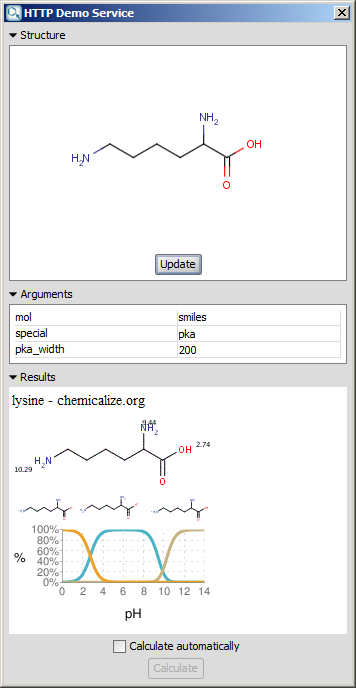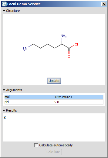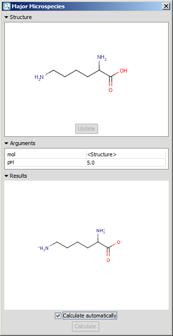 - Calculate automatically check box: If the structure is changed in MarvinSketch, the update of the structure and the