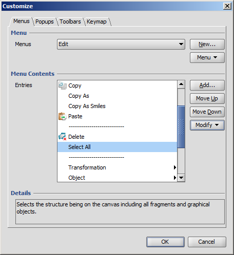 | Modify > Rename | Renames a sumbenu or menu element. You can also change the mnemonics by replacing the & sign in the name. |