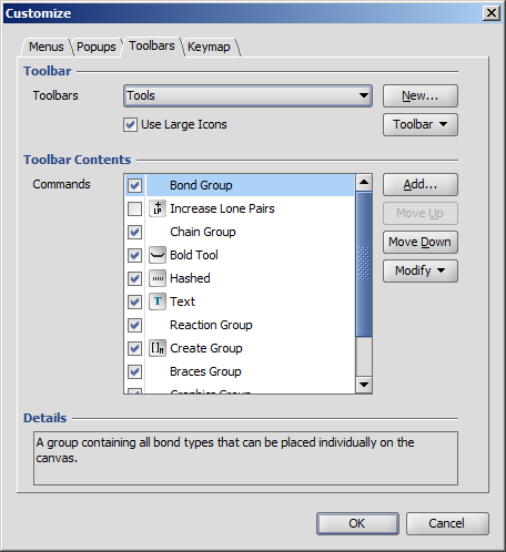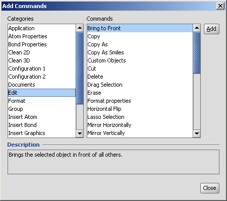| Add | Makes the Add Commands dialog visible, where you can browse all available commands of MarvinSketch. The commands are organized to Categories, and are listed in alphabetical order. |