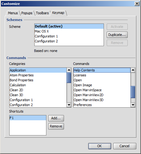 | Add | Makes the above Add Commands dialog visible, where you can browse all available commands of MarvinSketch. The commands are organized to Categories, and are listed in alphabetical order. |
