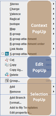 There are four pop-up menus (also called context or right-click menus) available in MarvinSketch: