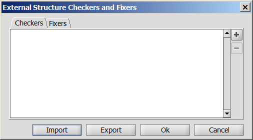 You can add various external checkers and/or fixers from the same or from different JAR files. The integrated external checkers and fixers can be exported to or imported from a configuration XML by using the appropriate button (Export or Import). This configuration XML file stores the class, ID and JAR file location of the set checkers and fixers.